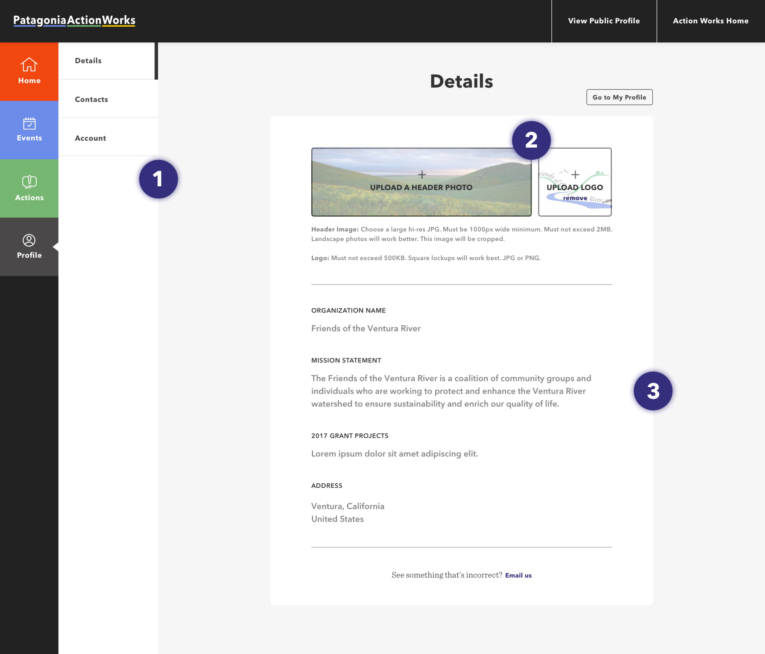 - Link your Facebook, Twitter, Instagram and LinkedIn accounts to your Patagonia Action Works profile so our audience can follow you directly.